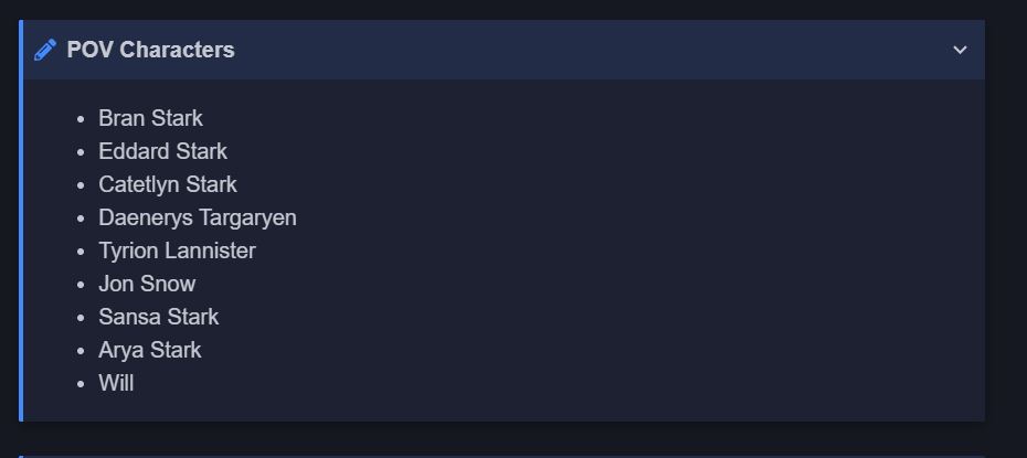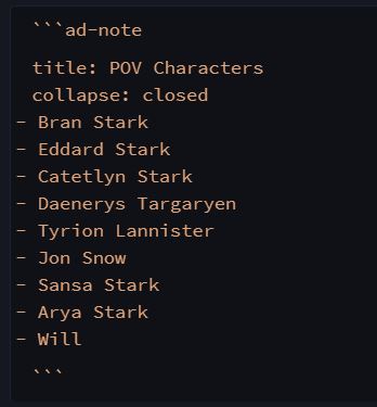 This is my map of content for my Game of Thrones page; you can see that I have collapsible lists which are something I've made using admonition. Doing it this way means I'm not worried about having to scroll through a large amount of content to be able to reach the things that I need on the page. I can simply put them in admonition blocks and go from there.